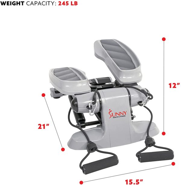 You can achieve a full-body, low-impact workout with minimal space by using the Sunny Health and Fitness SF-S0870 Versa Stepper. We’ve designed this stepper with a wide-body design and thick stabilizing feet to ensure maximum stability during your workout. Easily maintain balance on the ergonomic foot pedals that feature textured footpads. The quiet dual hydraulic-drive system, which supports up to 245 lb, is designed to condition your glutes, thighs, and calves as you step up and down. A glance at your time, calories burned, steps taken, and steps per minute with the convenient LCD. Attach the included removable resistance bands to perform upper-body exercises while you move. Feel confident in every step with the Sunny Health and Fitness SF-S0870 Versa Stepper.